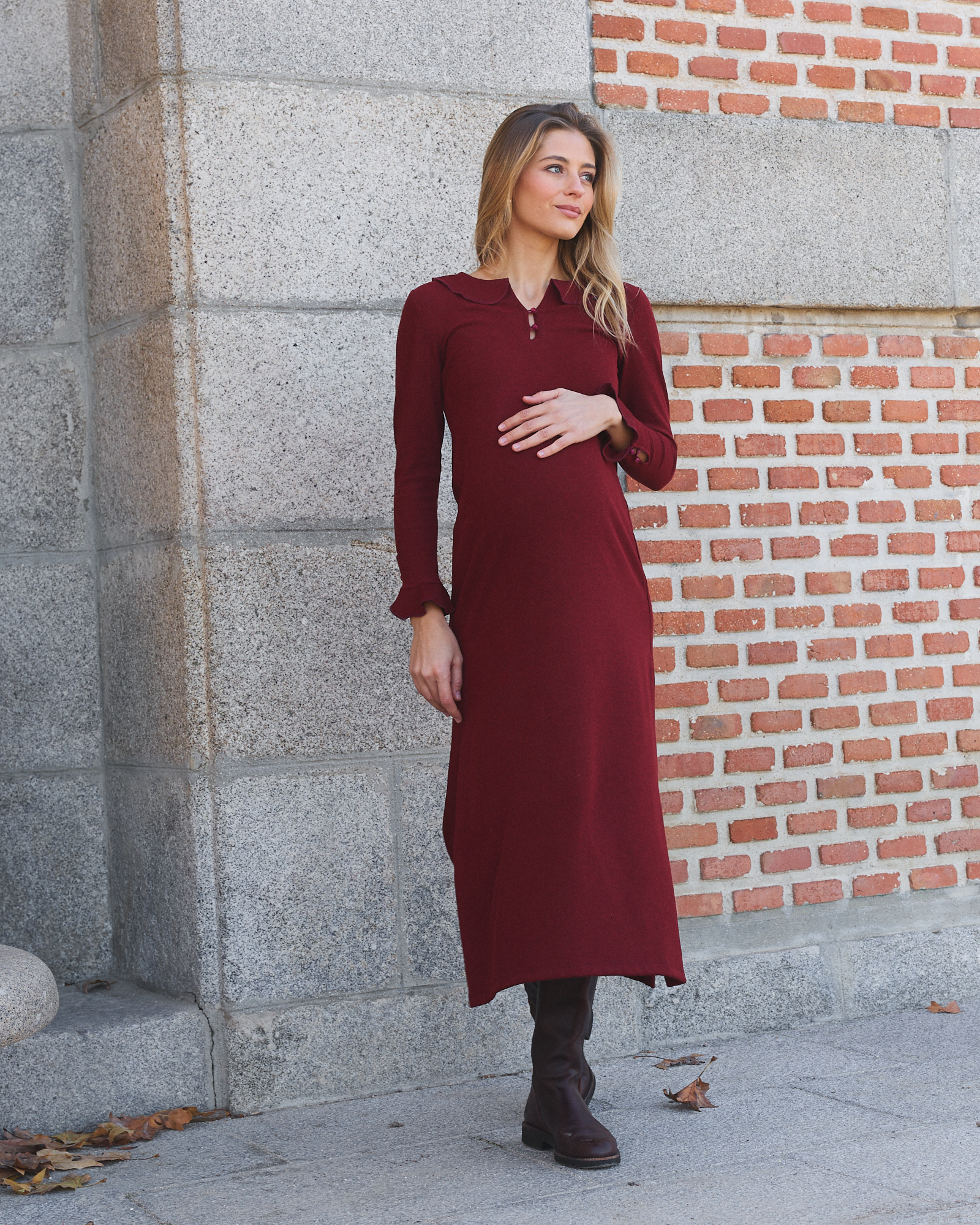 El vestido Sally está pensado para las que buscan un toque romántico en su día a día. Confeccionado en un tejido de punto burdeos que abraza tu figura con suavidad. Su encanto reside en los detalles: un elegante cuello y puños adornados con volantes y botones de diseño que elevan este modelo a otro nivel.